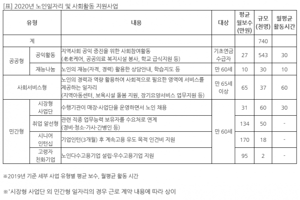 만 65세 이상 기초연금수급자 등은 공공의료 복지시설 봉사, 학교 급식지원 등 지역사회 공익 증진을 위한 사회참여 활동이나 지역아동센터·보육시설 돌봄 지원, 장기요양서비스 업무지원 같은 사회서비스형 일자리에 지원할 수 있다.