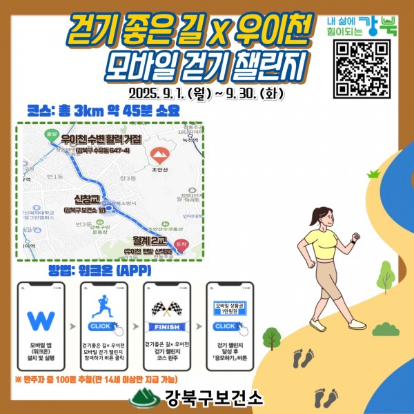 강북구민을 대상으로 한 이번 챌린지는 걷기 명소로 꼽히는 우이천 산책로 일대에서 진행된다. 코스는 우이천 수변활력거점을 출발해 신창교를 지나 월계2교 맨발 산책로까지 이어지는 총 3km다.