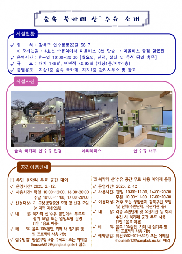 [강북구] 숲속 북카페 산`수유 공간 예약 및 대여 안내