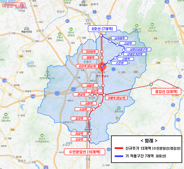 기존 성남시 구간에서 이용 가능했던 8호선 7개 역사(모란~남위례역)를 포함하면 성남시 구간에서 ‘기후동행카드’의 이용이 가능한 지하철역은 20개 역사로 확대된다.