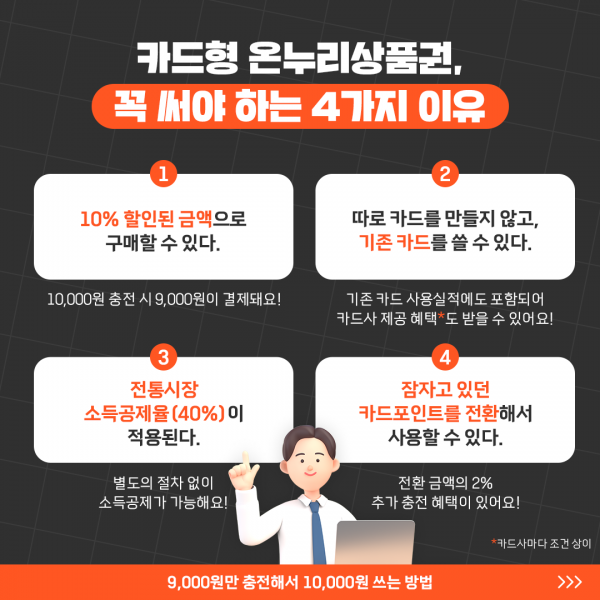 온누리상품권을 사용하고 계신가요? 저는 카드형 온누리상품권을 자주 사용하는데요. 별도 카드를 발급할 필요 없이, 자주 쓰는 카드를 앱에 등록해 10% 할인 받고 충전해 쓰고 있답니다. 김장철을 맞아 장 볼 일이 많은 요즘, 카드형 온누리상품권 활용 방법을 알아두셔서 알뜰 장보기에 도움받으시면 좋겠습니다.