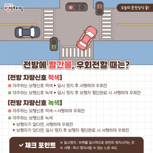 ‘우회전할 때 일시 정지 해야하나?’ 초보운전자나 오랫동안 운전해온 분들이라도 가끔 헷갈릴 때가 있으시죠. 도로 위 모두의 안전과 매너까지 챙길 수 있는 운전 상식 몇 가지를 정리해보았습니다. 오늘도 안전운전하세요.