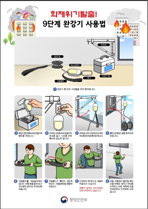 [안전] 긴급상황시 완강기 사용법, ‘걸고 던지고 조이고 내리고’ 기억하세요