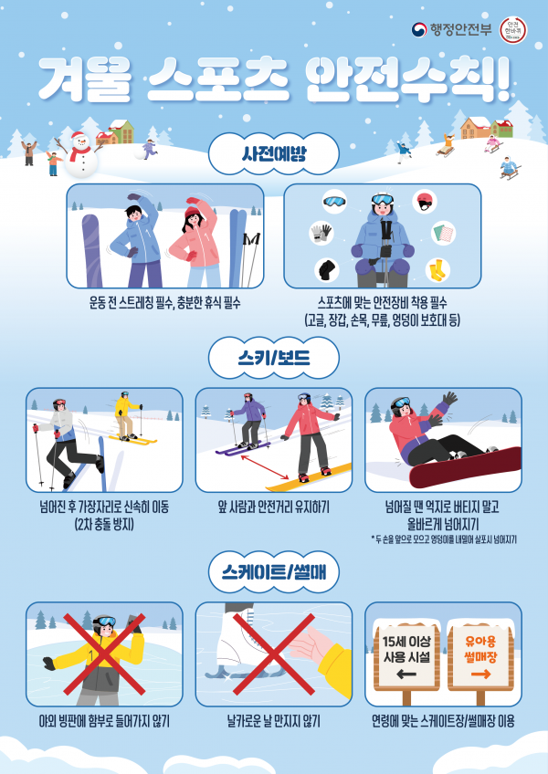 - 스포츠에 맞는 안전 장비 착용 필수(고글, 장갑, 손목, 무릎, 엉덩이 보호대 등)