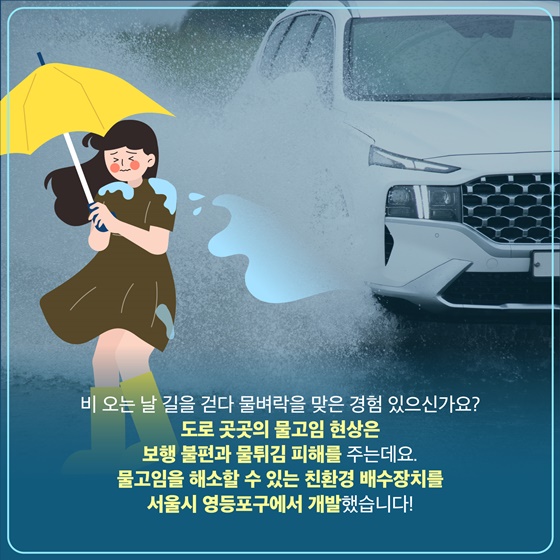 도로 곳곳의 물고임 현상은 보행 불편과 물튀김 피해를 주는데요. 물고임을 해소할 수 있는 친환경 배수장치를 서울시 영등포구에서 개발했습니다!