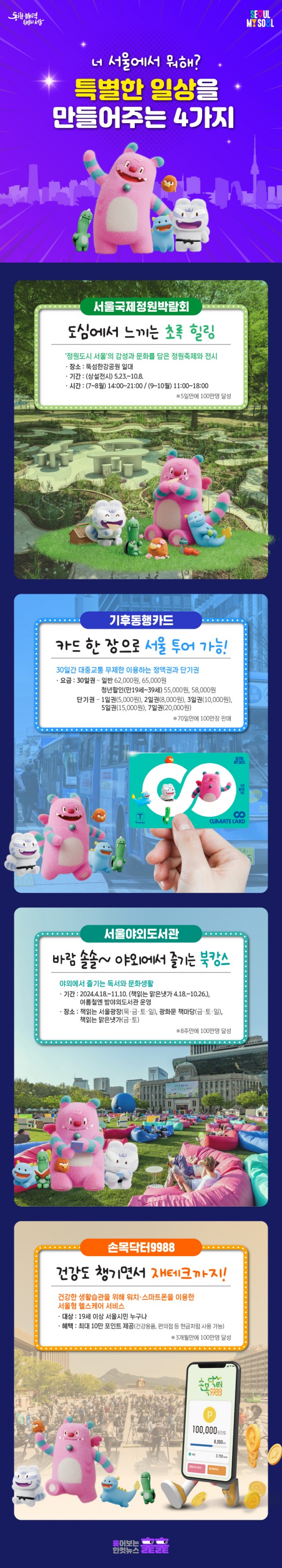 매일 똑같은 일상에 지치셨나요? 조금만 시선을 바꿔도 일상이 특별해집니다. 도심 정원을 느리게 산책하기, 서울 곳곳을 여행자처럼 다녀보기, 야외도서관에서 독서 삼매경에 빠져보기…. 어찌보면 평범하지만 일상에 활력을 불어넣어 줄 여러 방법이 있습니다. <내 손안에 서울>과 함께 소소하지만 특별한 일상 만들기, 시작해보세요.