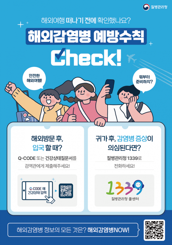 해외여행 전 해외감염병NOW 또는 질병관리청 콜센터 ☎1339에서 국가별 감염병 발생정보를 미리 확인할 수 있다.