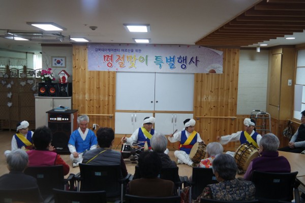 강북데이케어센터에서는 한해의 풍년과 안녕을 기원하는 명절(정월대보름)맞이 특별행사를 실시하였습니다. 본 행사는 재능기부 봉사 솟을 풍물단의 사물놀이, 만담, 민요공연을 관람하고 이어서 어르신 팀 대항으로 전통놀이 윷놀이’, ‘링고리 던지기부럼깨기 순으로 진행되었으며 센터 어르신들의 유대감 증진, 정서적 지지와 즐거움을 제공해 드림으로써 정월 대보름에 관한 기억회상을 통하여 인지기능의 유지에 도움이 되도록 하였습니다.