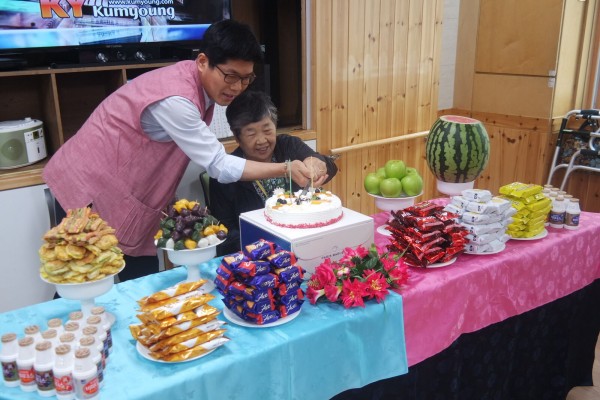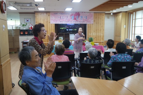 강북데이케어센터에서는 어르신들의 유대감 증진 및 즐거움 제공을 위하여 2018년 8월 어르신 생신잔치를 실시하였습니다. 본 행사는 센터 과장님 축하말씀을 시작으로 생신축하 노래 부르기, 선물증정식, 보호자에게 받은 손 편지 낭독, 즐거운 노래방강사, 직원들과 함께하는 여흥 순으로 진행하였습니다.