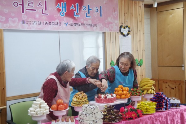 강북데이케어센터에서는 어르신들의 유대감 증진 및 즐거움 제공을 위하여 2018년 2월 어르신 생신잔치를 실시하였습니다. 본 행사는 과장님 축하말씀을 시작으로 생신축하 노래 부르기, 선물증정식, 보호자에게 받은 손 편지 낭독, 직원들과 함께하는 즐거운 노래방 공연 순으로 진행하였습니다.