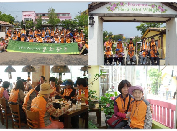 시립강북노인종합복지관병설 강북데이케어센터에서는 이용자의 정서순화 및 사회성향상을 위해 상반기 문화활동을 실시하였습니다.파주 프로방스마을과 헤이리마을에서 진행된 이번행사에서는 이국적인 마을을 둘러보며 어르신과 자원봉사자 간의 즐거운시간을 가졌습니다. ▣ 일 시 : 2013년 5월 24일(금), 10:00~18:00▣ 장 소 : 파주 프로방스마을 및 헤이리마을 ▣ 대 상 : 센터 이용자 16명