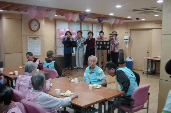 이용 어르신의 생신을 축하하기 위해 강북하모니카 동아리(최옥자 단장 외 4명)의 하모니카공연이 진행되어 이용 어르신들 모두 즐거운 시간을 보냈습니다.