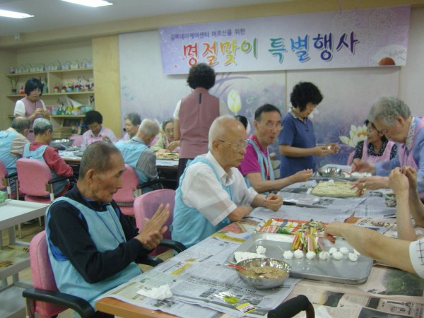 강북데이케어센터에서는 민족 대명절인 한가위를 맞이하여 전통 민속놀이와 명절맞이 프로그램을 진행하였습니다. 명절음식인 송편빚기, 산적꼬치 등을 만들며 옛 이야기를 나누고 오랫만에 둘러앉아 윷놀이도 하고 투호놀이를 하면서 즐거운 시간을 보냈습니다. 이번 행사를 통해 옛 풍습을 되살리고 이용자 간 회상능력 증진 및 유대감을 높일 수 있는 기회가 되었습니다.