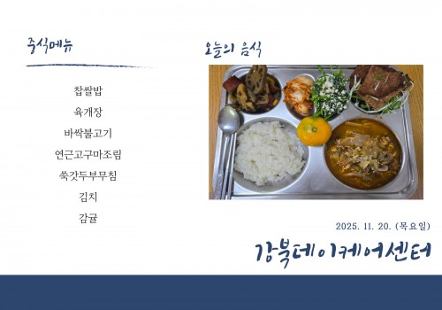 [데이케어] 2025년 11월 20일(목) 중식·간식·석식 식단