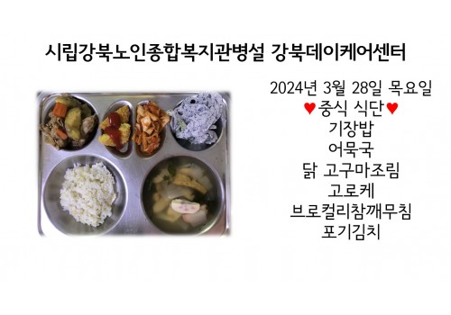 [데이케어] 2024년 3월 28일(목) 중식·간식·석식 식단