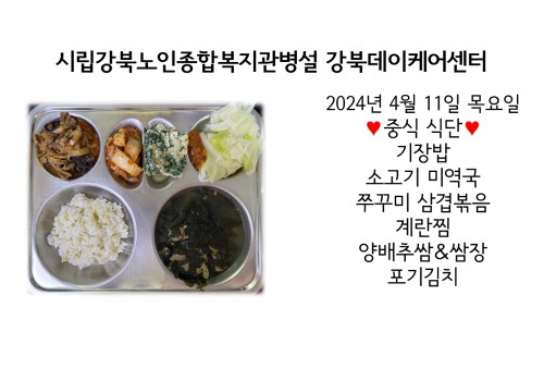 [데이케어] 2024년 4월 11일(목) 중식·간식·석식 식단