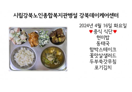 [데이케어] 2024년 4월 16일(화) 중식·간식·석식 식단