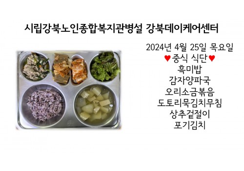 [데이케어] 2024년 4월 25일(목) 중식·간식·석식 식단