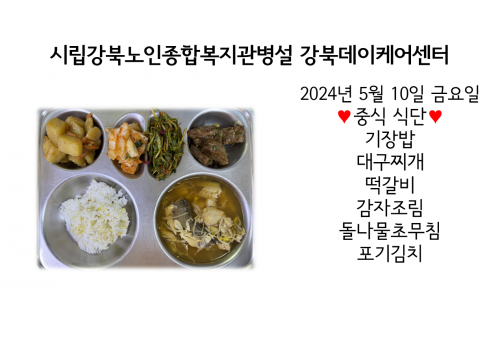 [데이케어] 2024년 5월 10일(금) 중식·간식·석식 식단