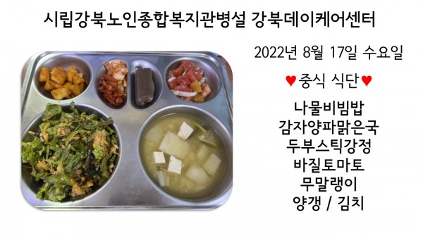 2022년 8월 17일(수) 중식 식단입니다.(클릭하면 사진을 더 크게 보실 수 있습니다.)