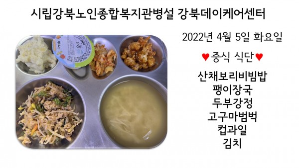 2022년 4월 5일(화) 중식 식단입니다. (클릭하면 사진을 더 크게 보실 수 있습니다.)