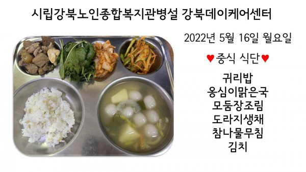 2022년 5월 16일(월) 중식 식단입니다. (클릭하면 사진을 더 크게 보실 수 있습니다.)