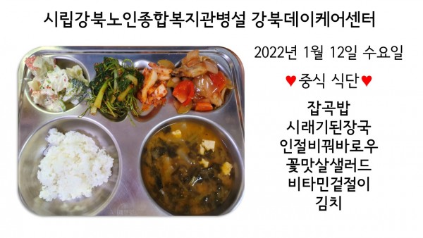 2022년 1월 12일(수) 중식 식단입니다. (클릭하면 사진을 더 크게 보실 수 있습니다.)