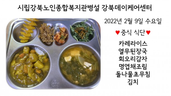 2022년 2월 9일(수) 중식 식단입니다. (클릭하면 사진을 더 크게 보실 수 있습니다.)