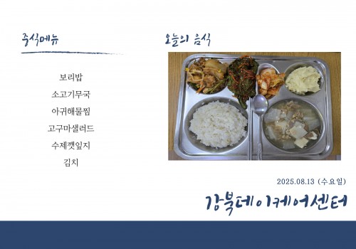 [데이케어] 2025년 8월 13일(수) 중식·간식·석식 식단