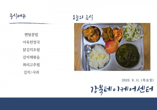 [데이케어] 2025년 9월 11일(목) 중식·간식·석식 식단