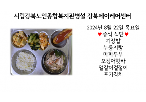 [데이케어] 2024년 8월 22일(목) 중식·간식·석식 식단