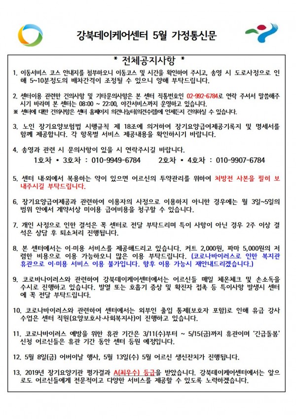 2020년 5월 강북데이케어센터 가정통신문입니다