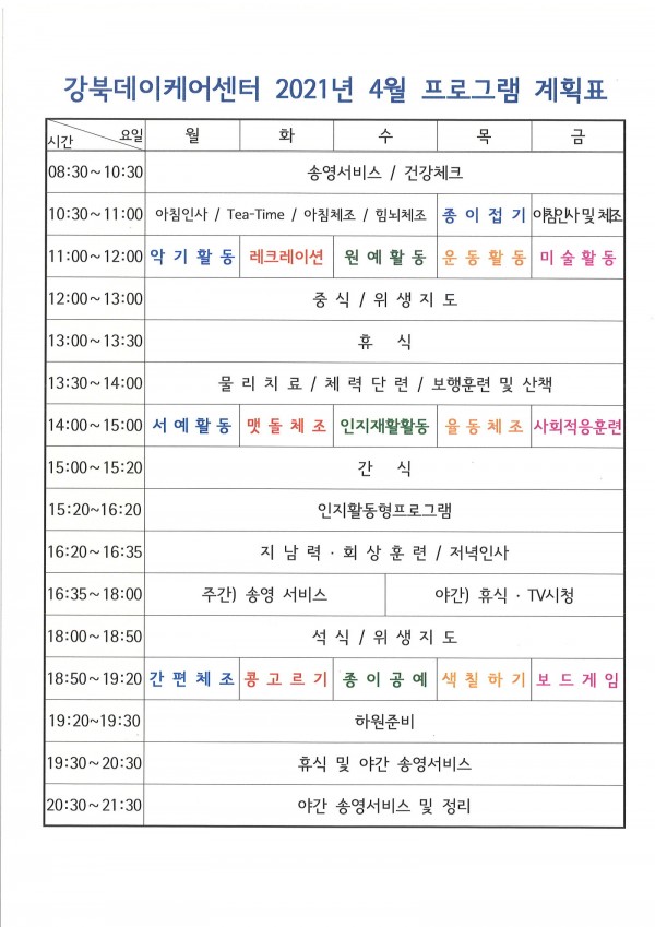 2021년 4월 강북데이케어센터 프로그램 계획표입니다.