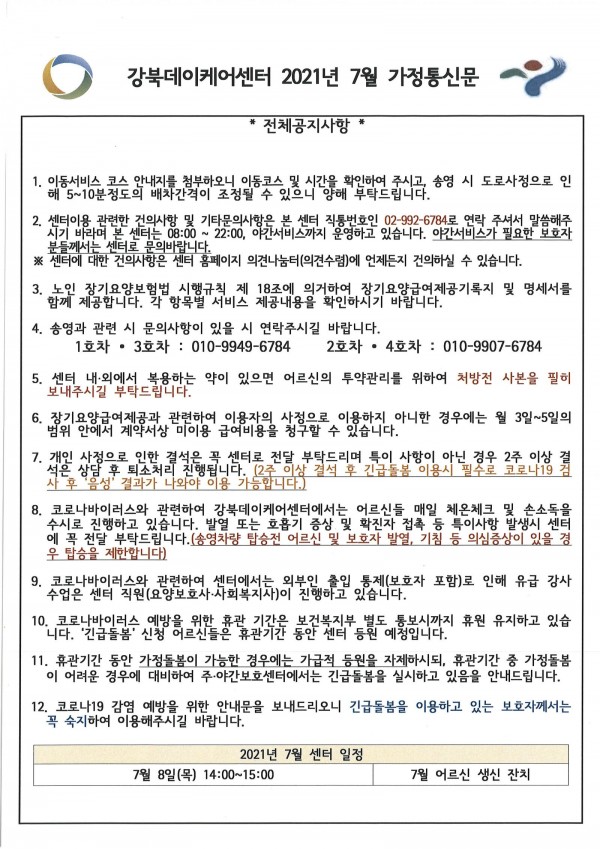2021년 7월 강북데이케어센터 가정통신문입니다.