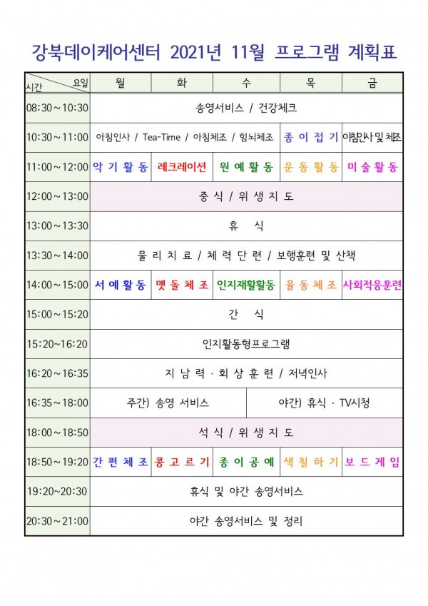 2021년 11월 강북데이케어센터 프로그램 계획표입니다.
