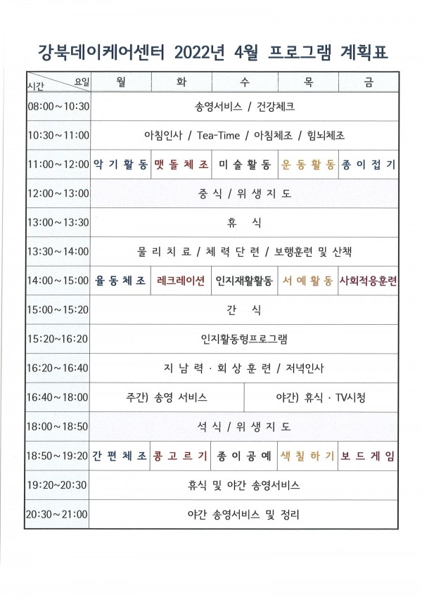 2022년 4월 강북데이케어센터 프로그램 계획표입니다.