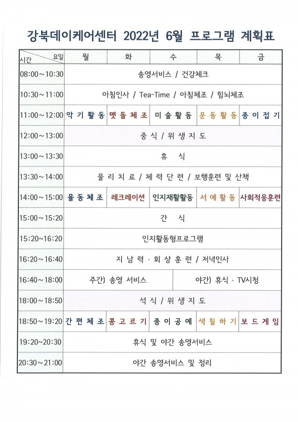 2022년 6월 강북데이케어센터 프로그램 계획표입니다.