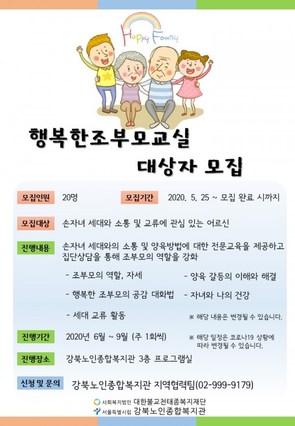본 복지관 지역협력팀에서는 2020년 행복한조부모교실 참여자를 모집합니다. 참여 희망 어르신은 신청 바랍니다.