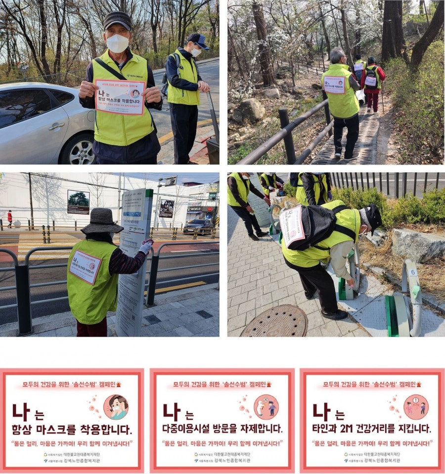 이에 발맞춰 우리 강북노인종합복지관과 어르신들도 모두의 건강을 위한 '솔선수범' 캠페인을 함께하고 있습니다.