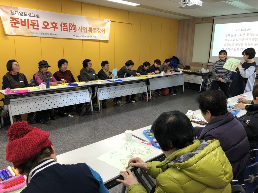 지역협력팀에서는 웰다잉프로그램「준비된 오후」사업 참여자 및 지역어르신을 대상으로 특별강좌 두번째 시간을 가졌습니다. 서울시 건강증진과 '서울시와 함께하는 찾아가는 웰다잉 교육’을 연계하여 노래와 미술활동을 접목하여 고향 그림, 추모의 화병을 만드는 등의 새로운 방식의 웰다잉 교육을 진행하였습니다. 교육을 통해 참여자의 과거와 현재를 되돌아보고 웰다잉에 대한 지속적인 관심을 가질 수 있는 기회가 되었습니다.
