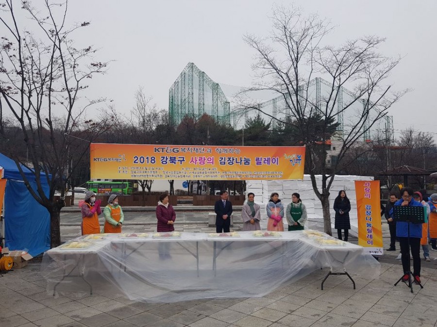 본 기관에서는 KT&G복지재단과 함께하는 2018 강북구 사랑의 김장나눔 릴레이 행사를 2018년 11월 21일 9시부터 북서울꿈의숲 아트센터 앞 광장에서 진행하였습니다. KT&G복지재단의 주최로 진행된 본 행사는 시립강북노인종합복지관을 포함하여 강북구 내 8개 복지기관의 참여로 진행되었습니다.