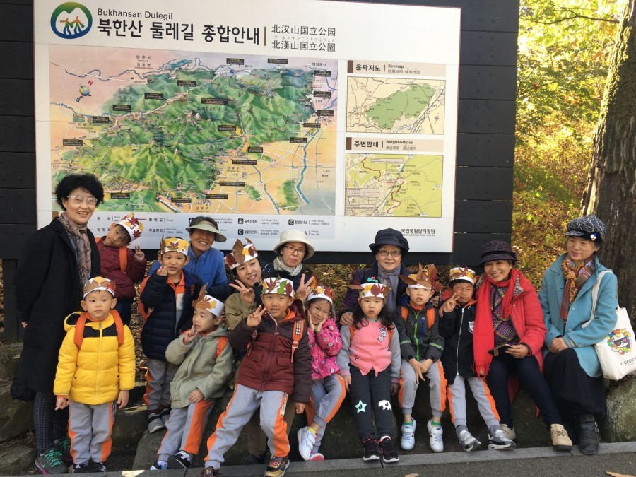 참여복지과 실버문화재지킴이사업 1. 3세대 통합 프로그램 '할아버지. 할머니와 함께 걷는 북한산둘레길' 자원봉사 어르신들과 강북구 새롬어린이집 대상으로 프로그램 진행하였습니다. 북한산둘레길 걷기 및 전통민화파우치 만들기 체험활동을 통해 1.3세대통합에 기여하는 기회를 가졌습니다.