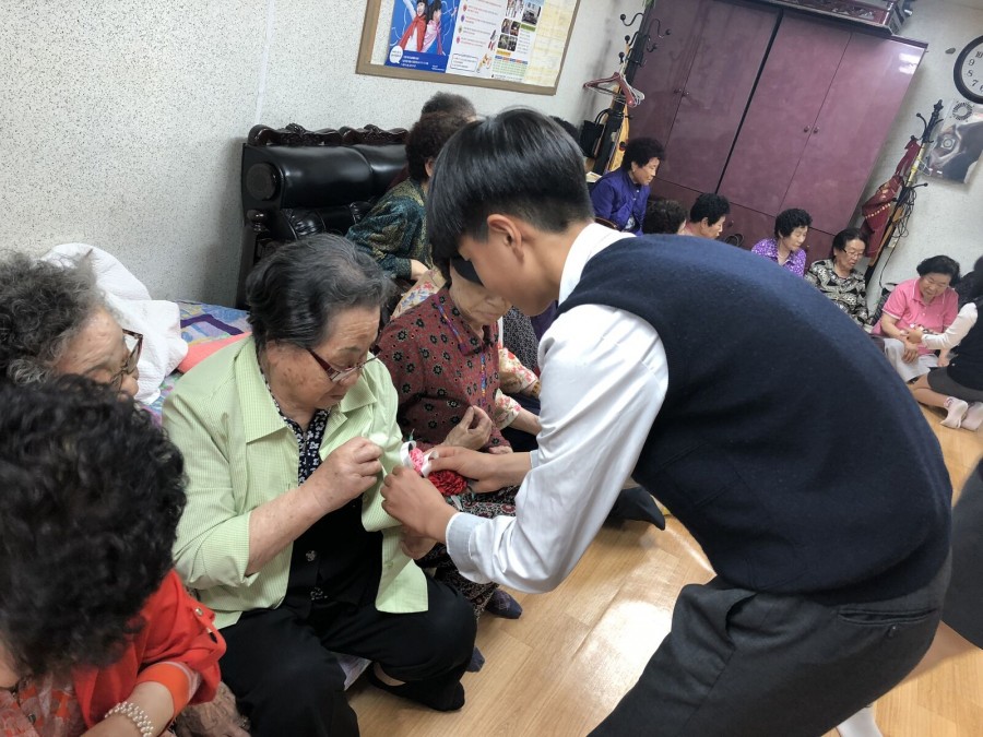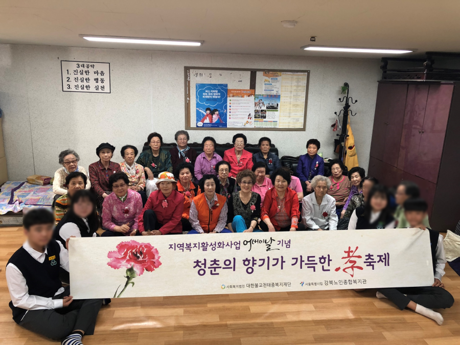 수유·수송·강북중학교 학생들이 직접 만든 카네이션을 어르신께 직접 달아드리고 함께 다과를 나누어 먹으며 노인공경과 세대간의 이해를 증진하는 시간을 가지게 되었습니다.