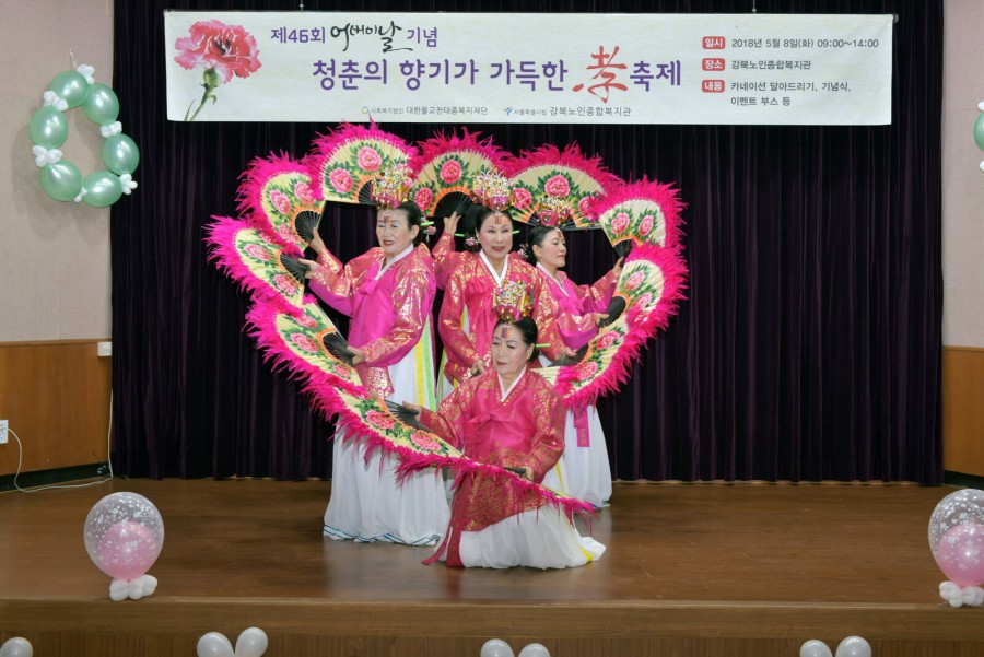 제46회 어버이날 기념 축제에서는 카네이션 달아드리기, 식전공연(오렌지어린이집, 희망강북봉사단(한국무용, 댄스스포츠)), 기념식, 중식, 레크레이션&골든벨, 행운권 추첨 및 이벤트 부스(다트&투호, 네일아트, 염주만들기, 랜덤놀이, 치매검사, 취업상담, 바자회)가 진행되었습니다.