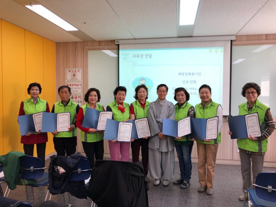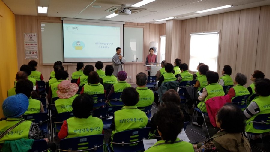 참여복지과 주민참여팀에서는 노년기 자원봉사를 활성화하고자 '희망강북봉사단'을 조직하여 운영하고 있으며, 이와 관련하여 신규 및 기존 봉사단원을 대상으로 활동선포식을 진행하였습니다. 이번 행사에서는 관장님 인사말 , 신규단원 위촉장 전달, 기본소양교육 순서로 진행하였습니다.