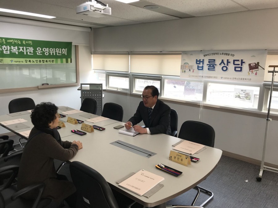 종합상담사업에서는 이용자 어르신들을 대상으로 생활 속에서 발생되는 법적문제의 해결을 돕고자 정석진변호사 사무소, 대한법률구조공단과 연계하여 무료법률상담을 진행하였습니다.