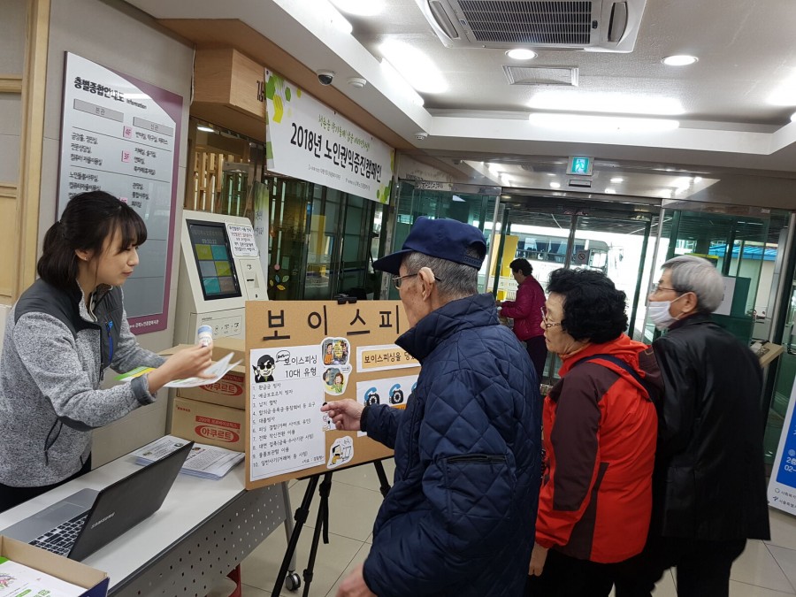 권익증진사업에서는 보이스피싱예방을 주제로 권익증진캠페인을 진행하였습니다. 복지관 이용회원을 대상으로 보이스피싱의 유형, 예방법 등에 대한 정보를 제공하였습니다. 어르신들의 권익을 위해 꾸준히 노력하는 복지관이 되겠습니다.