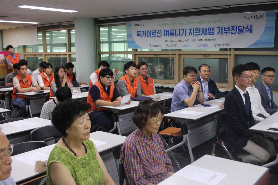 지역복지과에서는 서울시복지재단, 서울시나눔카(그린카, 쏘카, 에버온)와 연계하여 경로식당사업, 밑반찬배달사업, 노인돌봄기본서비스사업 참여대상자 145명에게 여름나기 물품(선풍기, 여름이불)지원을 위한 기부금전달식을 진행하였습니다.