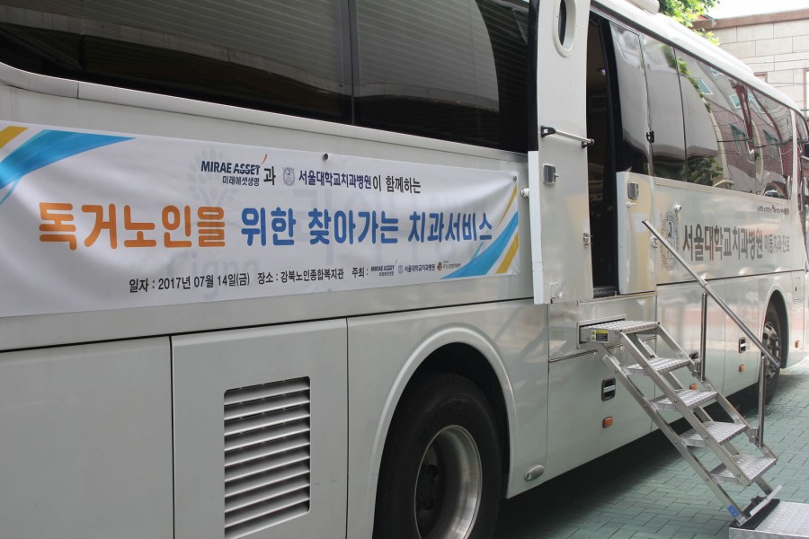 지역복지과에서는 노인돌봄기본서비스 사업 참여 어르신 64명을 대상으로 미래에셋생명과 서울대학교치과병원이 함께하는 '독거노인을 위한 찾아가는 치과서비스' 행사를 진행하였습니다. 서울대학교치과병원 의료봉사단 20명이 어르신들께 구강보건교육, 구강검진, 치과진료(발치, 스케일링, 충치치료, 틀니수리 등) 서비스를 제공하였습니다.