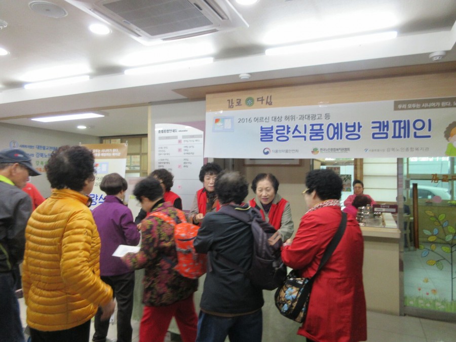 평생교육사업에서는 식품의약품안전처, 한국노인종합복지관협회의 지원으로 지역 내 어르신의 사기피해예방을 위해 불량식품예방(떴다방) 교육을 총 4회기를 진행하였습니다. 이에 지역 내 어르신들의 피해를 예방하고자 복지관 1층 로비에서 캠페인을 진행하였습니다.